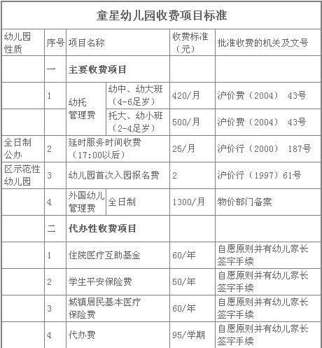 非地段生 小班:600-1000元/人/月,中大班:500-800元/人/月 地段生 小班:230元/人/月,中大班:200元/人/月 伙食费:6.5元/人/天 代办费:250元/人/学期 住院医疗互助基金:60元/人/年 保险费:60元/人/年 基本医疗保险费:60元/人/年